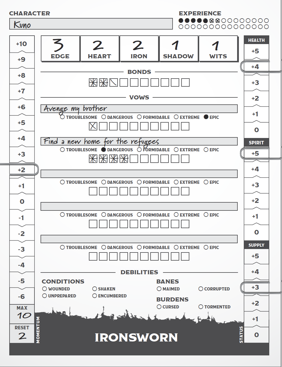 That gives me what I need to resolve the original “It is stressful” outcome of the Face Danger move. I Endure Stress (page 95) and suffer -2 spirit as a result of seeing the warrior killed. Per the move, I “roll +heart or +spirit, whichever is higher.” Since my heart is 2 and my spirit track is now at +3, I’ll roll with spirit.