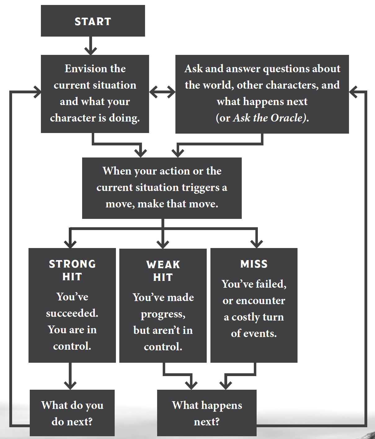 A weak hit or a miss means you don’t have control of the situation. Instead of acting, you react. What happens next? If you’re playing with a GM, they’ll determine how the world responds. Otherwise, you rely on your intuition and occasional oracle rolls to drive the narrative.